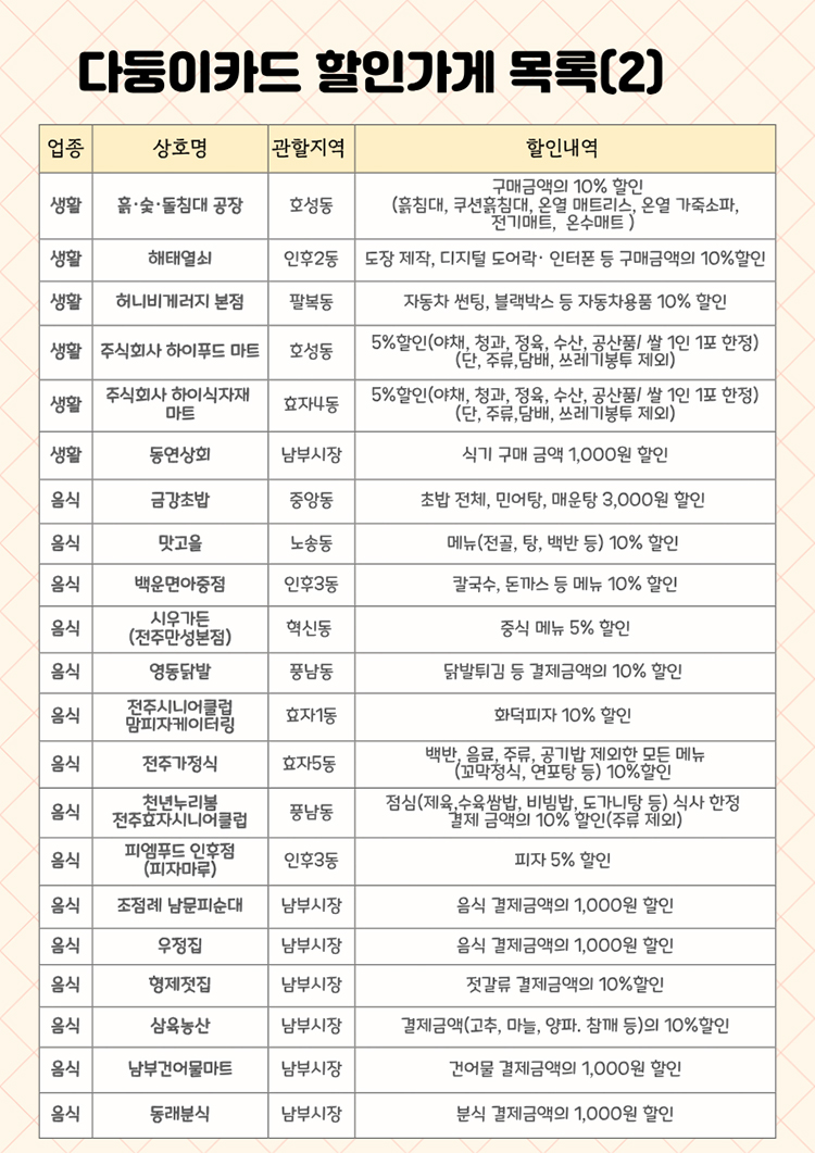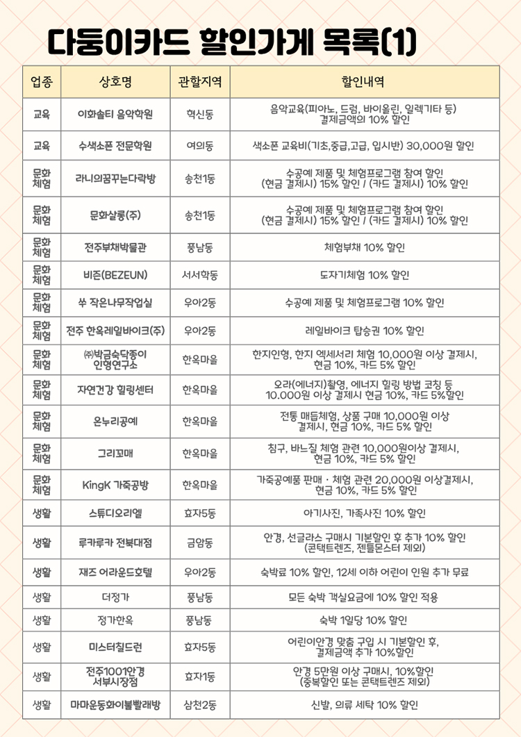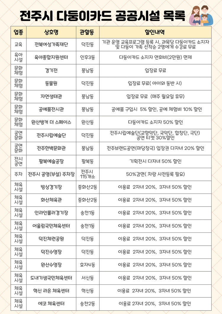 - (다둥이카드 소지자) 완산벙커 더 스페이스-입장권 50%, 공예품전시관-공예품 구입시 구입액의 5% 할인/공예 체험시 체험비의 10% 할인, 전주한벽문화관-전주브랜드공연(마당창극) 입장권 20% 할인, 팔복예술공장-기획전시 50% 할인, 전주시립예술단-공연 티켓 30% 할인, 육아종합지원센터 연회비(2만원) 면제