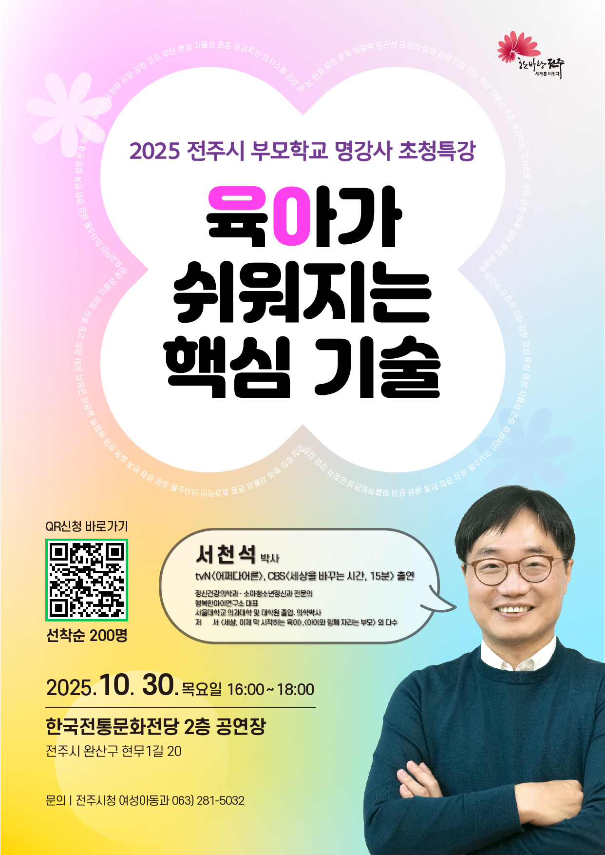 - 제목 "육아가 쉬워지는 핵심기술(서천석 박사)" 「2025 전주시부모학교 명강사 초청 특강」신청 접수 안내
