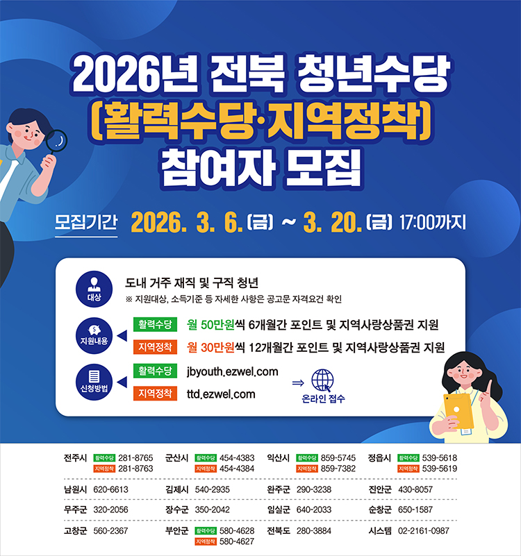 - 담당부서 : 전주시 청년활력과(063-281-8765), 전북특별자치도 인구청년정책과(063-280-3884)