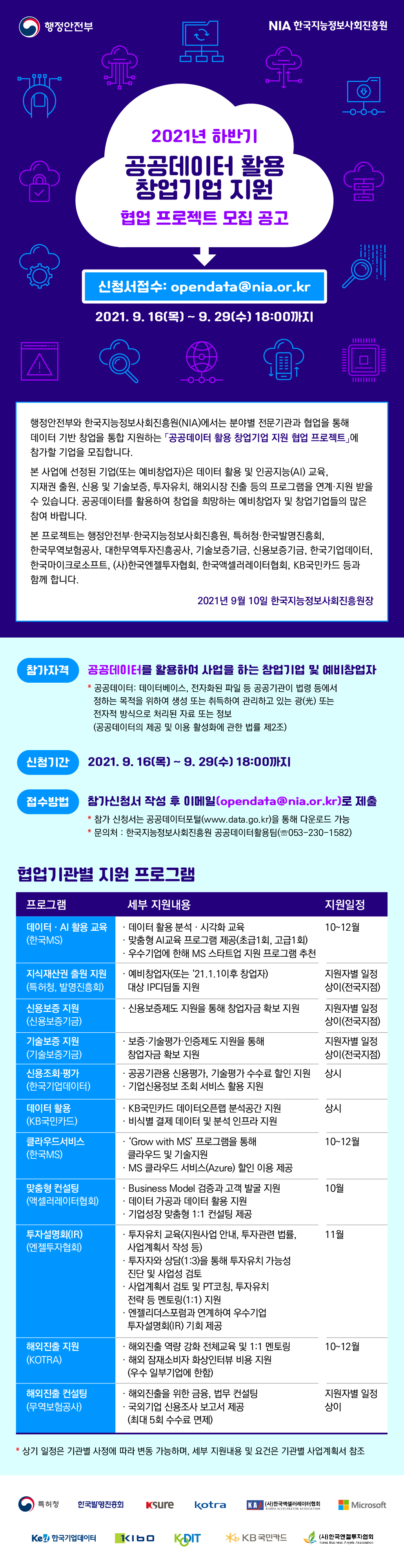 행정안전부와 한국지능정보사회진흥원(NIA)에서는 분야별 전문기관과 협업을 통해 데이터 기반 창업을 통합 지원하는 「공공데이터 활용 창업기업 지원 협업 프로젝트」에 참가할 기업을 모집합니다.