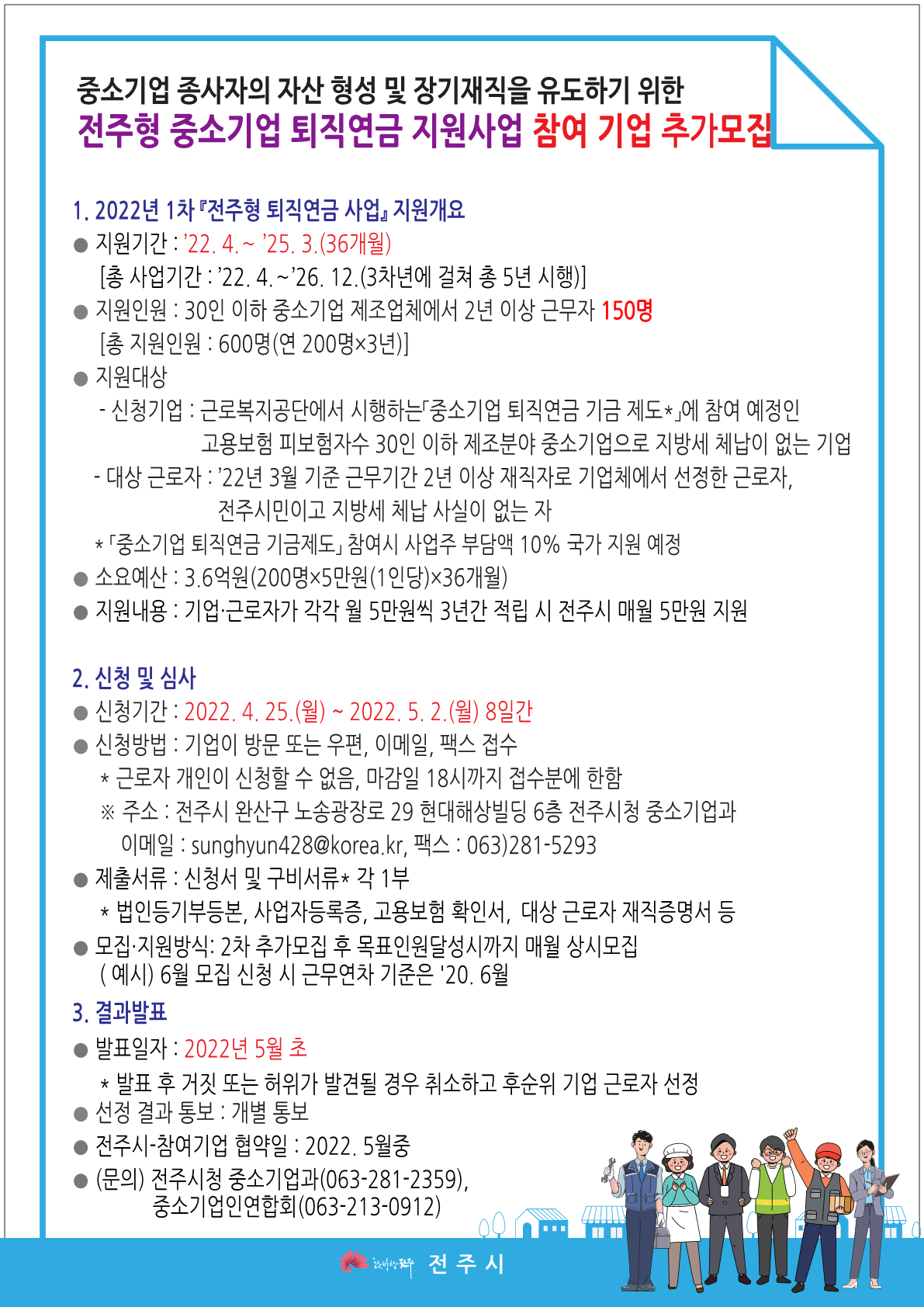 전주시에서는 근로복지공단에서 시행 예정인「중소기업 퇴직연금 기금제도」와 연계한「전주형 중소기업 퇴직연금 지원사업」의(이하‘전주형 퇴직연금 사업’)의 22년 1차년도 참여 기업 추가 모집을 시행하오니 참여를 희망하는 기업은 신청하여 주시기 바랍니다.