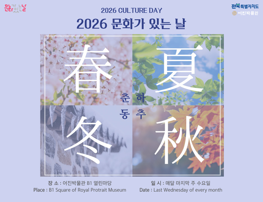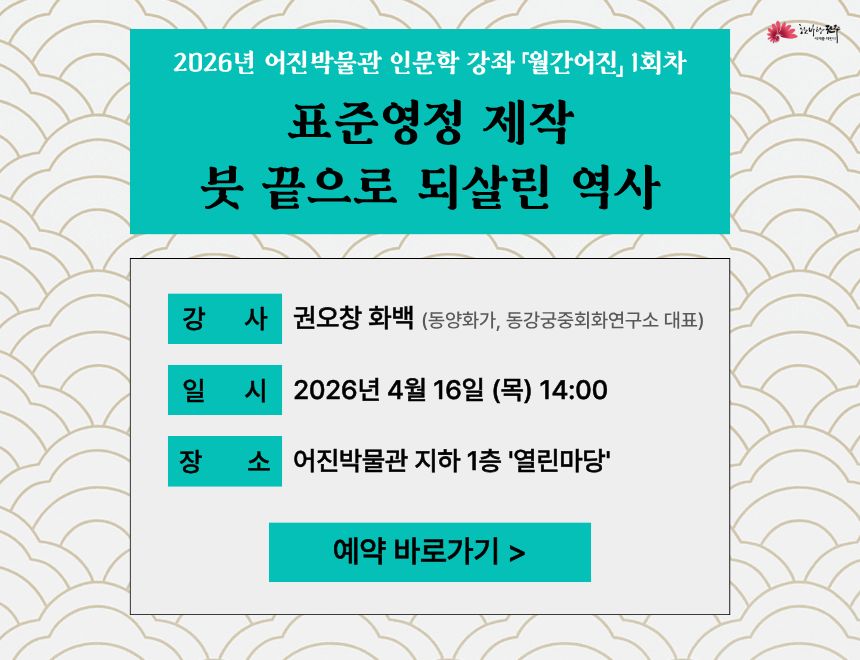 기획전시 2025-11-20 ~ 2026-02-08 왕실복식전 '결' 비단, 빛, 시간의 결을 따라 들여다보는 어진박물관 기획전시 왕실복식전 결 전시장소 : 어진박물관 B1층 열린마당 전시기간 : 2025.11.20.~2026.02.08. - 1차 : 2025.11.20.~2025.12.28... 자세히보기 2025-11-04 ~ 2025-11-14 「왕실문화 심층탐구 - 왕실단청」 참여자 결과물 작품전 어진박물관 왕실문화 ─ 심층탐구 참여자 작품전 어진박물관은 시민들의 전통공예에 대한 관심이 높아짐에 따라, 전통 공예품의 제작 과정을 이해하고 직접 작품 제작에 참여함으로써 전통공예를 체험하고 향유할 수 있는 장을 마련하고자 ‘왕실문화 심층탐구’ 프로... 자세히보기 2025-07-19 ~ 2025-08-12 전주시 무형유산 기능보유자 전시 - 백년일로 [대관전시] 전주시 무형유산 기능보유자 전시 <백년일로> 기간 : 2025. 07. 19.(토) ~ 08. 12.(화) 09:00 ~ 18:00 장소 : 어진박물관 지하1층 열린마당 1, 2부로 나뉘어 전시가 운영됩니다. 1부:... 자세히보기 이전 다음 교육 및 행사 2026-05-07 ~ 2026-05-07 [체험교육] 왕실화장 - 왕실문화클래스 3회차 3회차 왕실화장(면약과 조두 만들기) 예약신청 페이지입니다. - 안내사항 - 2026. 4. 23. (목) 14:00 부터 신청 가능합니다. 1인당 1자리만 신청 가능합니다. 체험료는 무료이나, 입장 시 경기전 입장료는 지불하고 오셔야합니다... 자세히보기 2026-04-16 ~ 2026-04-16 [인문강좌] 표준영정 제작, 붓 끝으로 되살린 역사 - 월간어진 1회차 주제 : 표준영정 제작, 붓 끝으로 되살린 역사 2026. 4. 2. (목) 14:00 부터 신청 가능합니다. 1인당 1자리만 신청 가능합니다. 박물관에 별도 주차장은 없으니 참고바랍니다. 접수마감 : 2026.04.16. 18:00 예정 자세히보기 2026-04-23 ~ 2026-04-23 [체험교육] 왕실인장 - 왕실문화클래스 2회차 2026. 4. 9. (목) 14:00 부터 신청 가능합니다. 1인당 1자리만 신청 가능합니다. 체험료는 무료이나, 입장 시 경기전 입장료는 지불하고 오셔야합니다. 박물관에 별도 주차장은 없으니 참고바랍니다. 접수마감 : 2026.04.21... 자세히보기 이전 다음